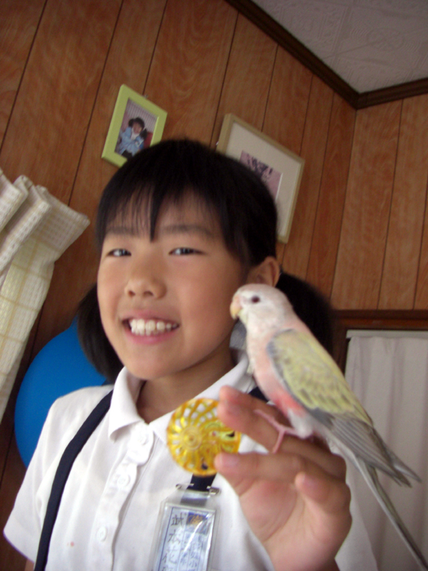 ほのちゃん、最近、頭や肩に乗ってきてくれます。のーちゃんとは、重さが違うので、留まると、ずしっときます。でも、ほのちゃんがとまってると、絶対、のーちゃんが、これは私の~って追い出しにきます。