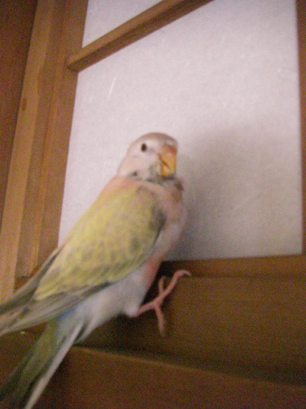 飛ぶのも、かなり上手になりました。ひよひよひよと浮いてるような飛び方だったのが、上手に旋回も出来るようになりました。でもやっぱり、とまるときには、べたっと、壁に張り付いたり、障子の桟にぶつかってます。同じ鳥でも、全然、違うんですね~!