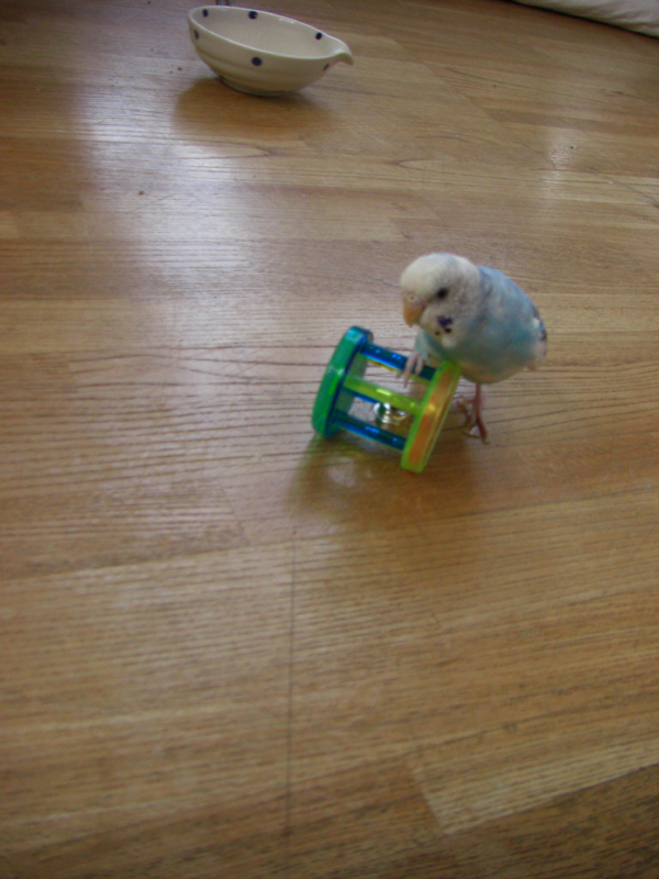 今までとケージの向きが違うので、ちょっと雰囲気が違ったんでしょうね。ケージに入らず、2階の部屋に戻ってしまいました。そして、部屋から出ようとしない!(肩にとまらせてドアを出ると、また部屋に戻るというのを何回もくりかえして、ようやく、自分からケージへ戻ってくれました。昼にはなれたらしく、いつもどおりにくつろいでいました。